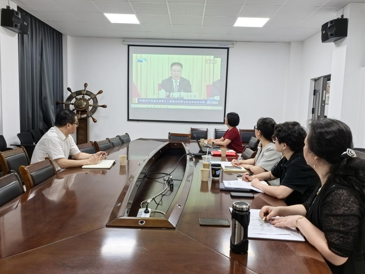与会成员观看新闻视频,集中学习中国共产党湖北省第十二届委员会第七次全体会议公报,深刻领悟全会的丰富内涵和精神实质。