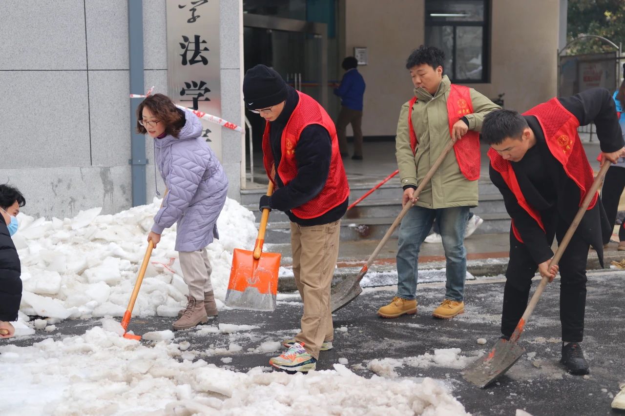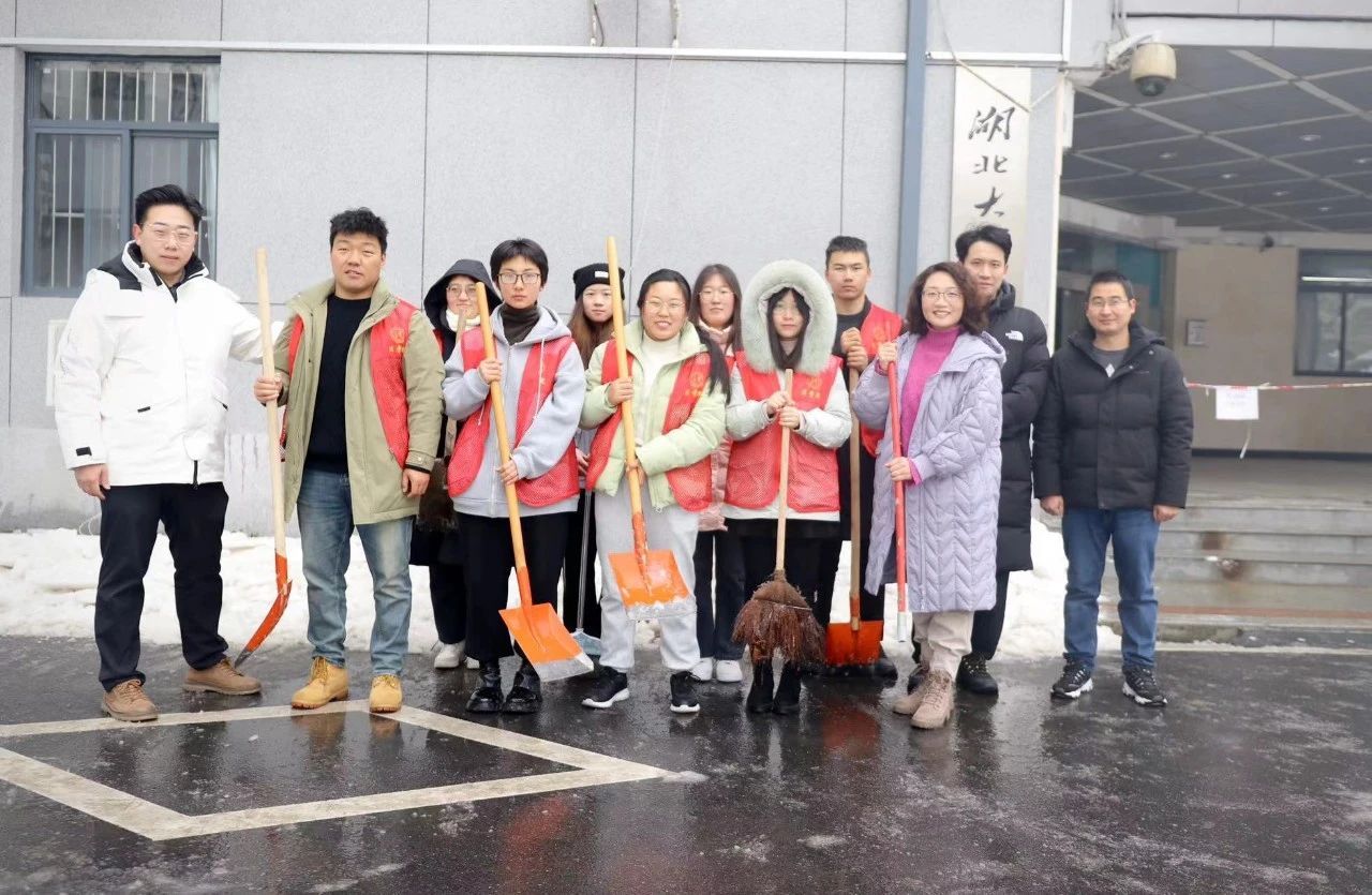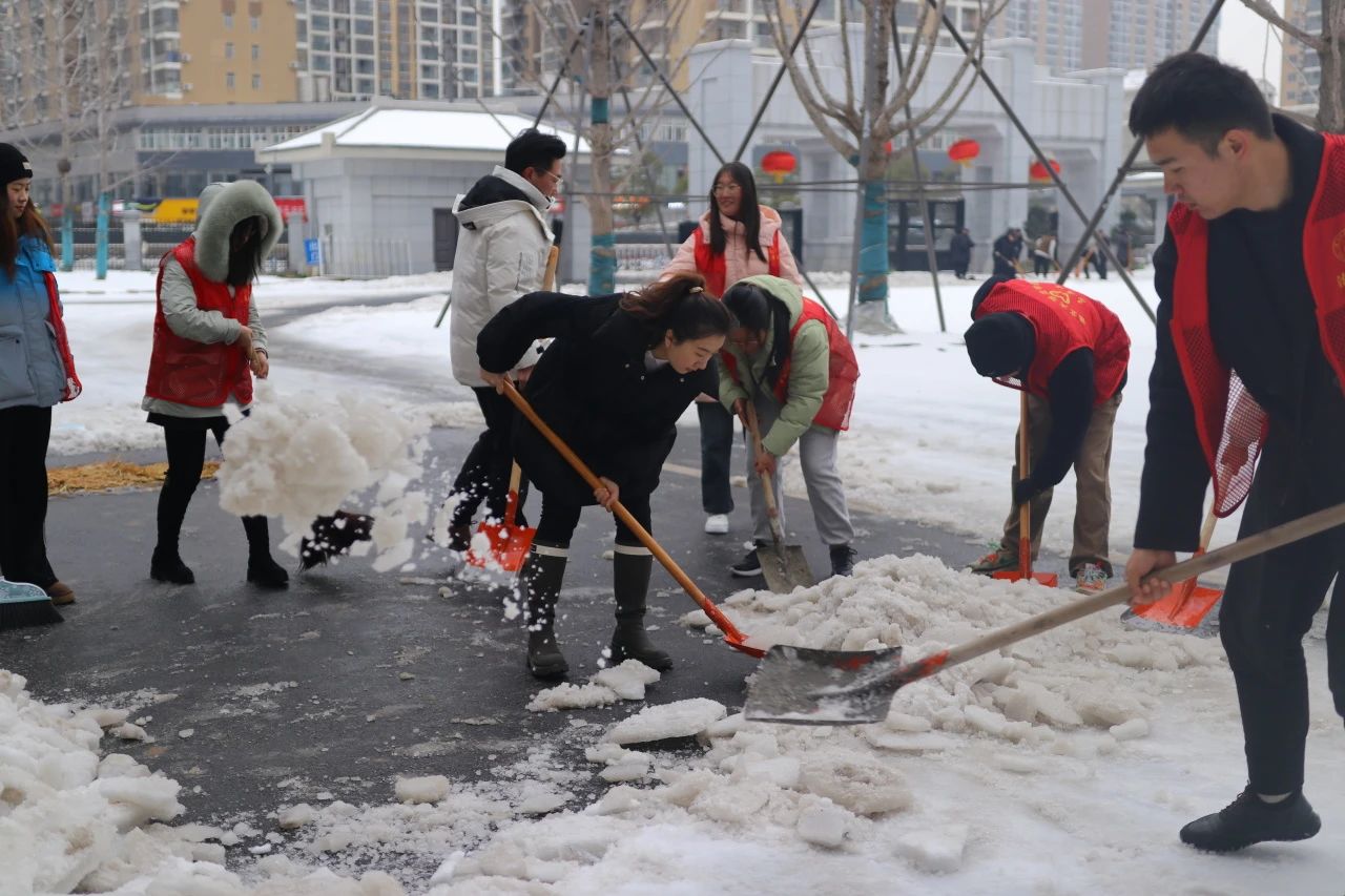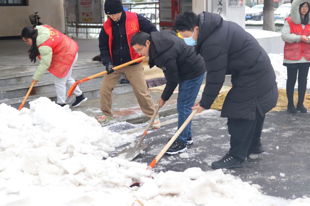 风雨送春归,飞雪迎春到。被冰雪夹霰洗礼后的伟德国际1946bv银装素裹,校园道路上积雪深厚。随着新学期的来临,为确保校园安全有序,让师生们顺利返校,bevictor伟德国际1946党委副书记张梦婵、教师蔡大顺、张颖、袁子轩、肖普焮、团委书记郭童以及各位学生志愿者们积极地参与了此次扫冰除雪的活动。