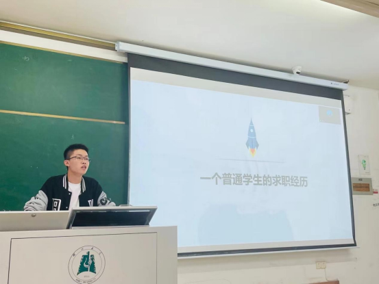 罗廷永作题为“一个普通学生的求职经历”的经验分享。他分享了自己的整个心路历程,从备考考研到法考及秋招,再到考研结束、备考考公最后到就业、投递简历,并指出要重视秋招和简历制作。