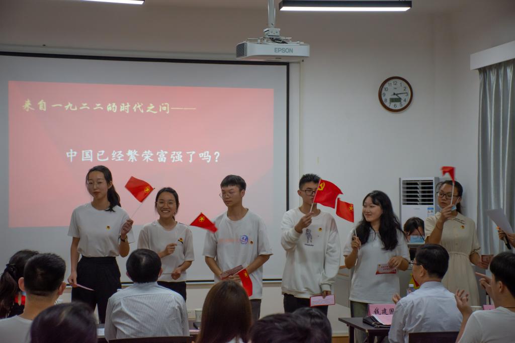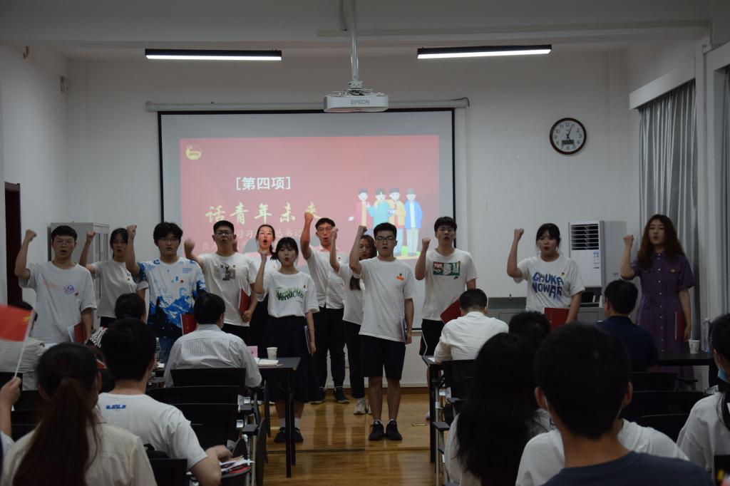 “我们是五月的花海,用青春拥抱时代......”活动在全体齐唱团歌声中拉开帷幕。全体青年团员面对鲜红团旗,庄严宣誓。团旗猎猎,誓言铮铮。2020级法学(卓越班)学生团员带来了互动情景剧《错位时空》,情景剧生动展现1919年“五四运动”时期青年学生为民族危亡奔走呼告的历史画面,以历史事件引发时代之问,以历史逻辑抒写历史感悟,2020级法学卓越班团支部面对“时代之问”,掷地有声做出了他们的青春之答。百年风云激荡,跨越错位时空,湖大学子、法学翘楚牢记党的教诲,立志民族复兴,勤奋学习,不负韶华。同学们认真学习习近平总书记在中国人民大学考察时的讲话,学生代表作了交流发言。大家回望百年历史,讲述青春故事,礼赞伟大祖国,团员代表诗歌朗诵—“请党放心,强国有我”并集体观看主题视频。