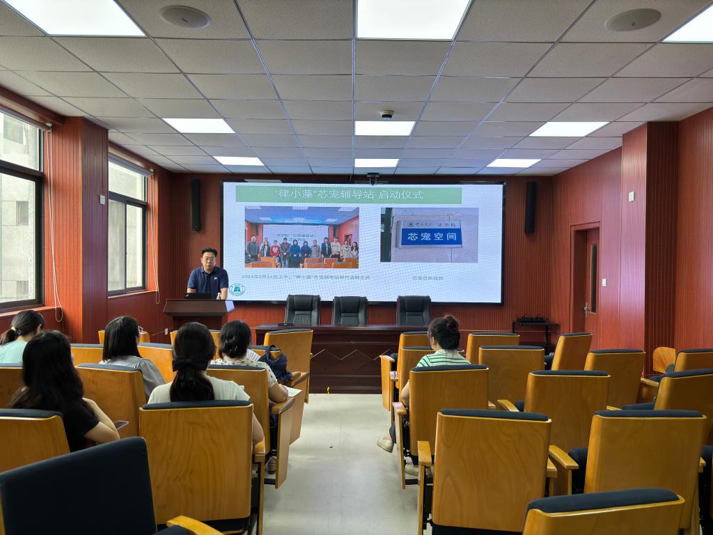 辅导员郭童针对我院“律小藻”芯宠辅导站建设情况,从健全体制机制,打造育人阵地;开展业务培训,筑牢安全底线;立足“五育并举”,青春一路生花等三个方面对芯宠辅导站的立项、设计、建设各个环节进行讲解汇报,并着重讲解了我院芯宠“小绿藻”的概念和内涵。