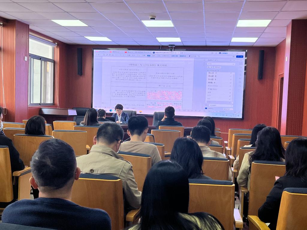 江岚副院长简要介绍了《学位法》的制定背景和过程,强调了《学位法》对于明确学术型与专业型人才分类培养机制、规范学位授予工作、推进教育、科技、人才一体化发展的重要意义。随后,副院长江岚逐条领学了《学位法》及其相关内容,并与1980年颁布的《中华人民共和国学位条例》进行比较分析,详细解读了学位工作的基本原则和具体要求。