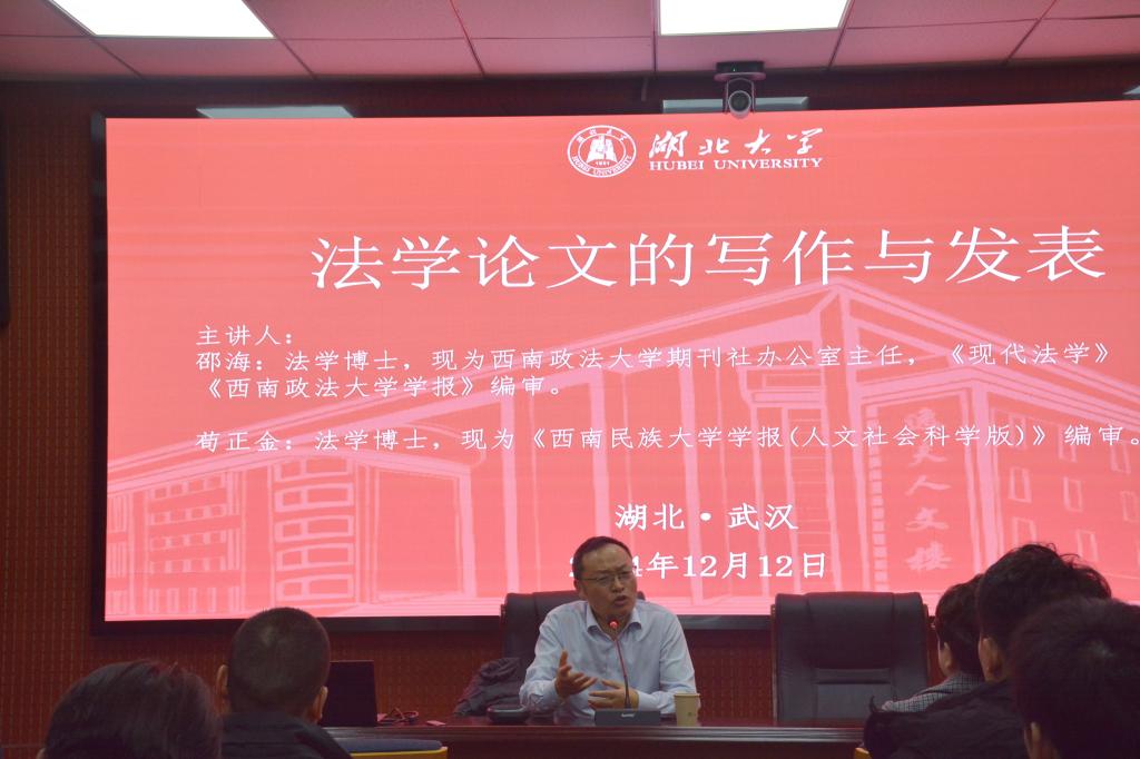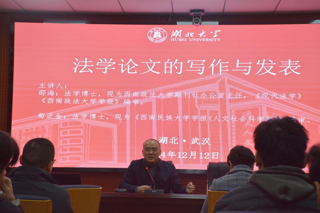 2024年12月12日bevictor伟德国际1946邀请《现代法学》《西南政法大学学报》编审邵海老师、《西南民族大学学报(人文社会科学版)》编审苟正金老师开展主题为《法学论文的写作与发表》的学术讲座,本次讲座由江岚老师主持,24级和23级法学研学生在bevictor1946报告厅参加,参加活动的同学针对相关话题进行了交流与探讨。