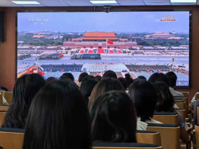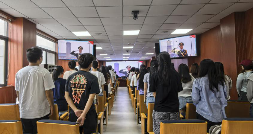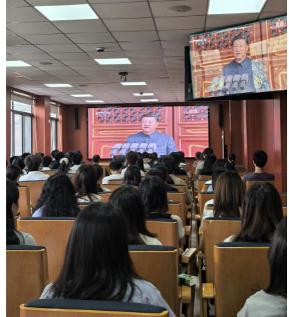 上午9时整,天安门广场举行了隆重的纪念大会,中共中央总书记、国家主席、中央军委主席习近平发表重要讲话,总书记强调,和平与正义因其正当性、崇高性和人民性而必然具备的合法性与最终必胜的结局。“正义的信念不可动摇,和平的期盼不可阻遏,人民的力量不可战胜。”观看过程中,师生们神情专注,总书记坚定的话语不仅叩击着每个人的耳膜,更重重地撞击在每一颗澎湃的心上。