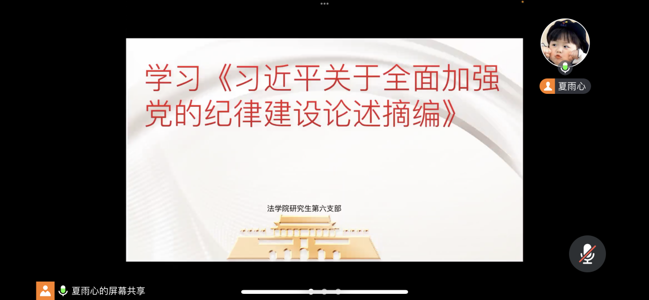 6月主题党日活动为“学习《习近平关于全面加强党的纪律建设论述摘编》”。本月主题活动由研究生第六党支部书记夏雨心开展线上讲课,第六党支部11名成员线上参与,许湘怡同志请假。