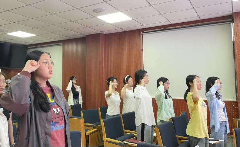 活动第二项,全体党员起立,庄严宣誓,重温入党誓词,全体党员在领誓人的带领下举起右臂共同宣誓,再一次用铮铮誓言诠释入党初心。