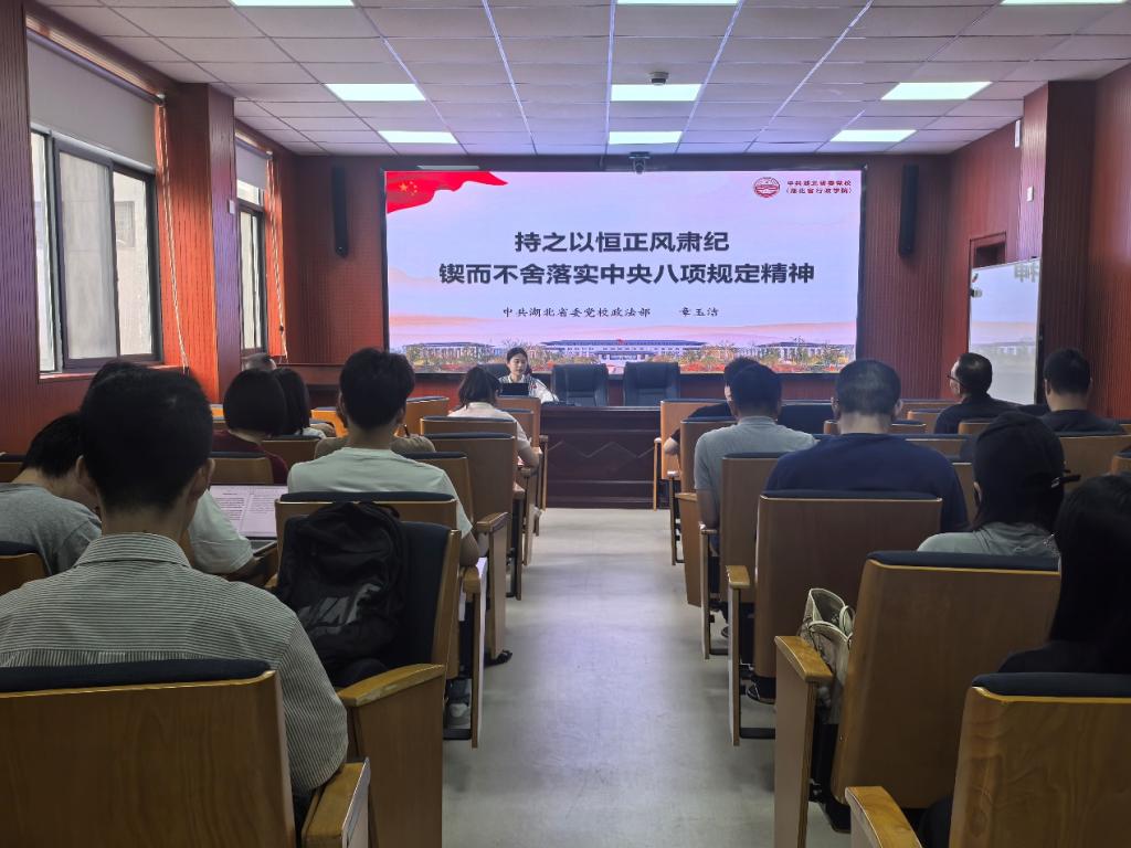 (通讯员:郭童)为深入贯彻中央八项规定精神学习教育,持续推进作风建设,4月28日下午,bevictor伟德国际1946在模拟法庭举办深入贯彻中央八项规定精神学习教育,特邀湖北省委党校章玉洁老师作题为《持之以恒正风肃纪 锲而不舍落实中央八项规定精神》的专题讲座。bevictor1946全体教职工、学生党支部书记参加了学习,活动由bevictor1946教师党支部书记蔡大顺主持。